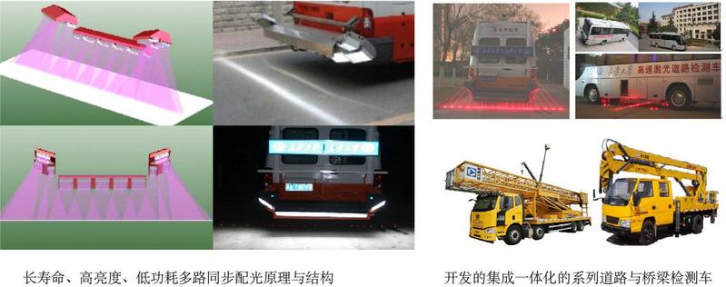 针对道路与桥梁智能检测理论与关键共性技术进行研究,首次提出了对称式激光位移检测方法和基准传递与多传感器融合检测方法,研发了高精度、高可靠、抗干扰性强的激光位移系列传感器和多功能激光路面检测系统,实现了道路路面平整度、构造深度、车辙、磨耗、跳车、变形类病害的高速动态检测。发明了长寿命、高亮度、低功耗多路同步配光、多路聚焦LED连续配光和频闪配光系统,解决了野外复杂光照条件下的路面与桥梁表面全天候高清成像检测难题。首次研发了道路与桥梁检测稀土超磁致伸缩换能器,发明了具有测强、测缺、测厚功能的混凝土结构层析成像检测系统及分析算法,实现了道路与桥梁混凝土结构三维数字成像分析。提出了面向道路与桥梁几何形态、结构参数、外观损伤、内部缺陷和预应力缺陷等方面的多源协同智能检测方法和安全性评价方法,开发了评价软件系统。