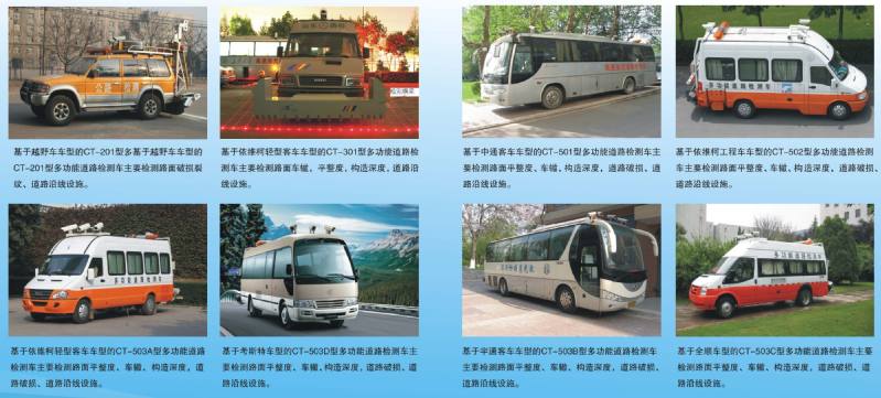 工程中心研发的“多功能道路检测车”实现激光路面检测技术、数字图像路面检测技术及现代车辆技术的创新集成,将激光路面数据采集系统、路面数字图像采集系统、路面坐标信息采集系统、道路沿线设施信息采集系统、数据传输存储系统、数据处理系统等集一体,实现了路面平整度、构造深度、车辙、磨耗、跳车、路面损坏、道路线形、道路沿线设施等指标的同时检测。图像采集系统采用具有自主知识产权的同步频闪照明光源和模块化LED聚焦照明光源,实现了低功率、长寿命的高质量的路面图像检测。开发了基于多种车型的检测车并且都取得国家公告目录,可以满足不同用户对道路检测的需求。